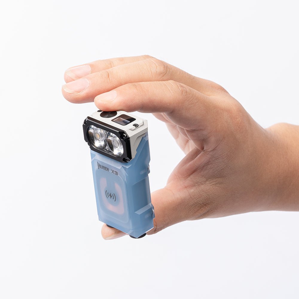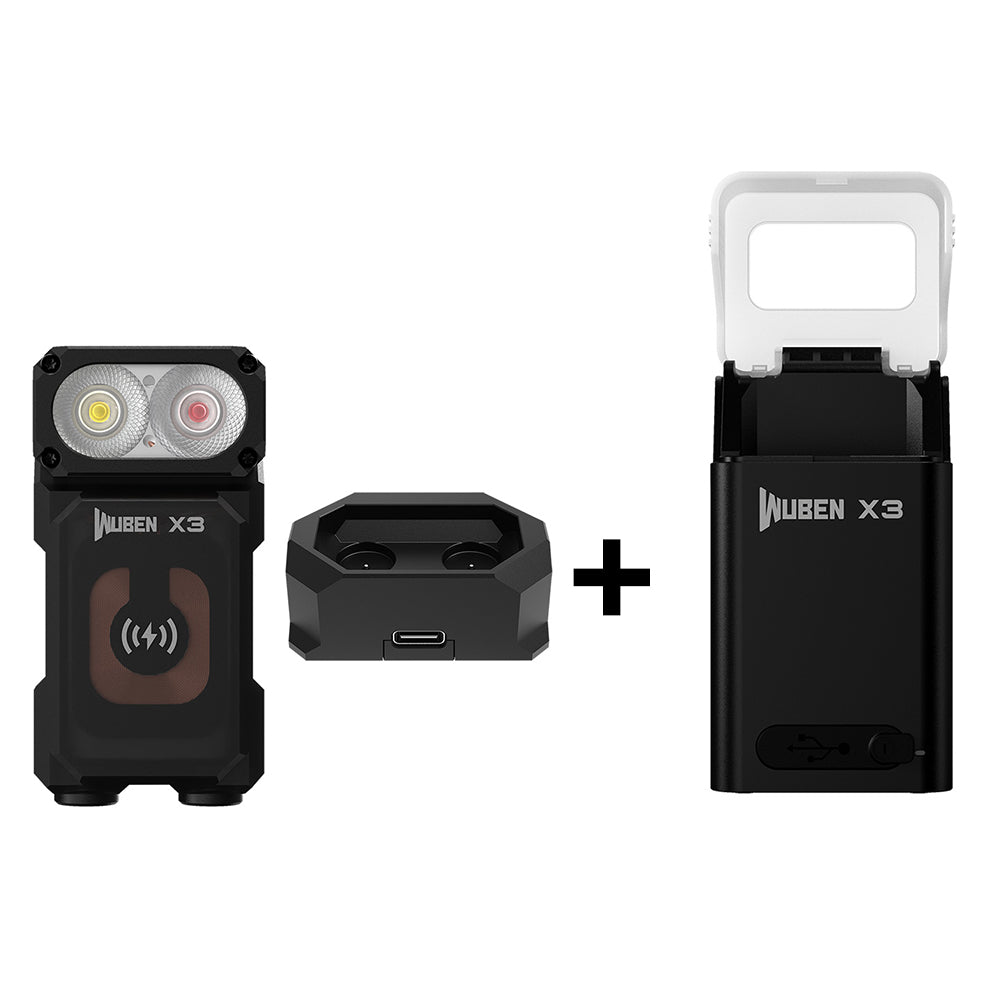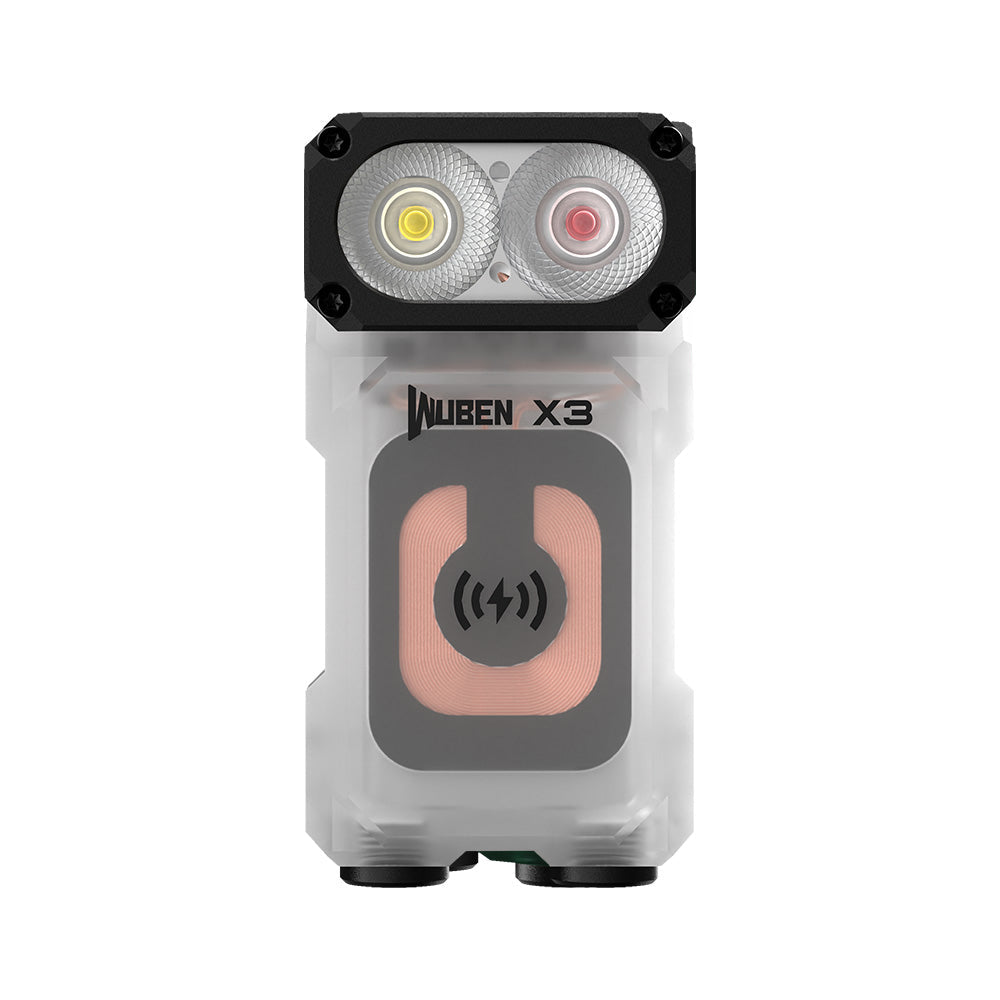 Wuben X3 é uma lanterna LED EDC multifuncional com cabeça giratória de 180°, peso ultraleve de 70g, carregamento sem fio, base magnética, LEDs duplos (vermelho e branco), indicador visual de bateria, 700 lúmens e vários modos de iluminação. É uma ótima ferramenta para atividades ao ar livre, segurança doméstica e trabalho noturno.